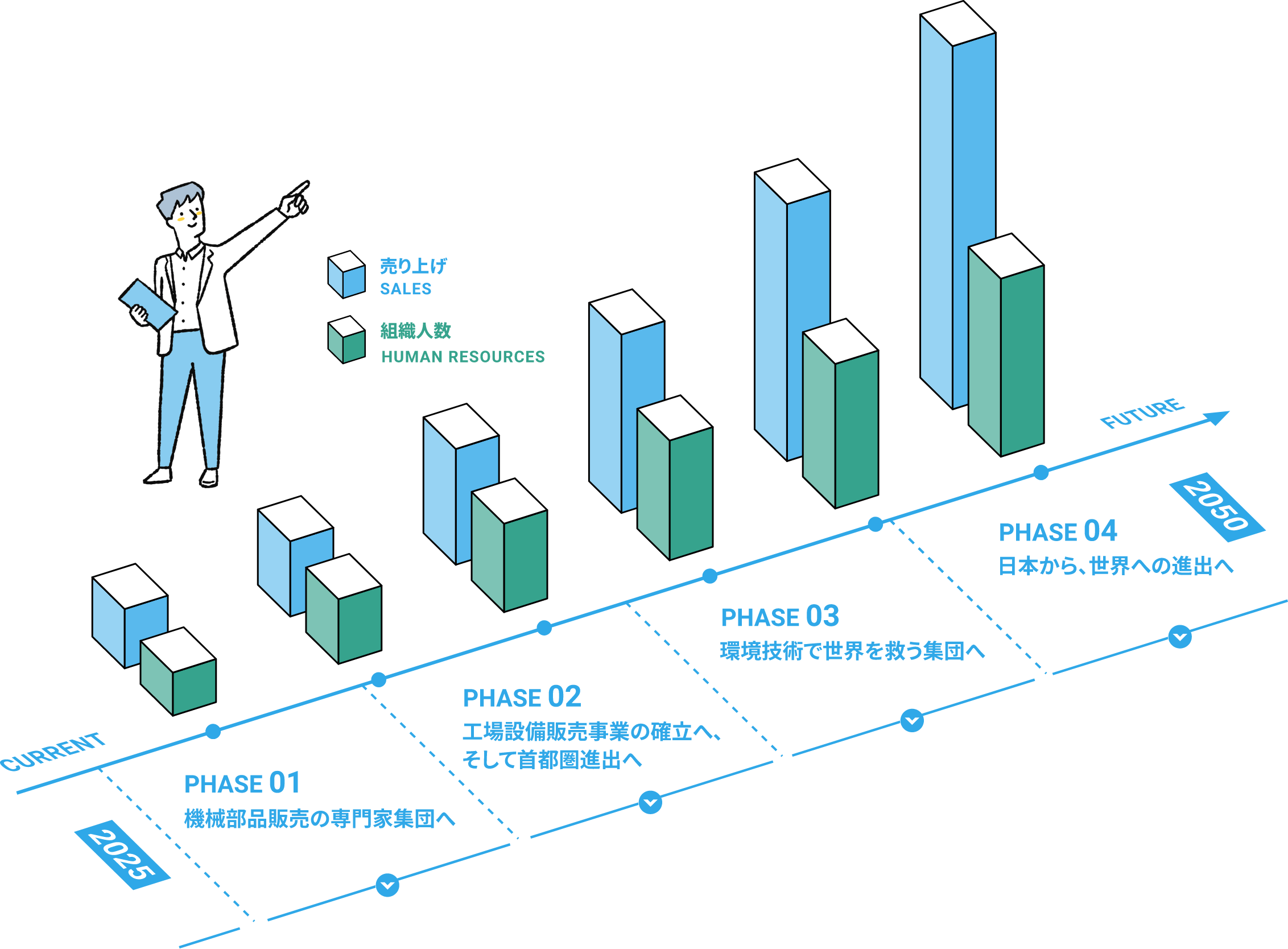 お客様と共に環境負荷を減らし、持続可能な社会を築くことは、次の世代に誇れる私たちの使命です。私たちは「機械専門商社」から「環境技術で未来を守る集団」へと変革を遂げていきます。 -
